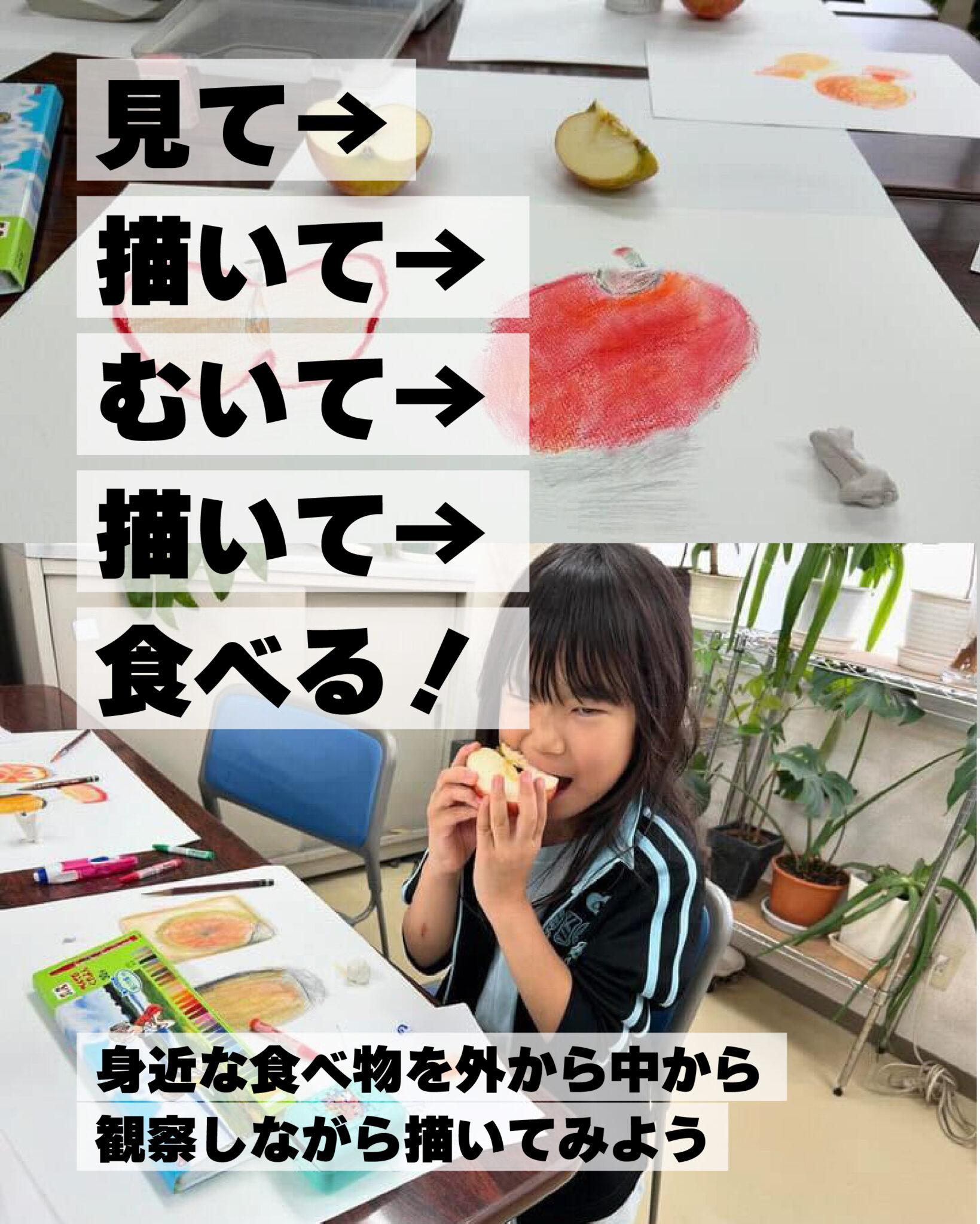 「切ってむいて」— 果物を“観察して”描いて、最後に食べる。